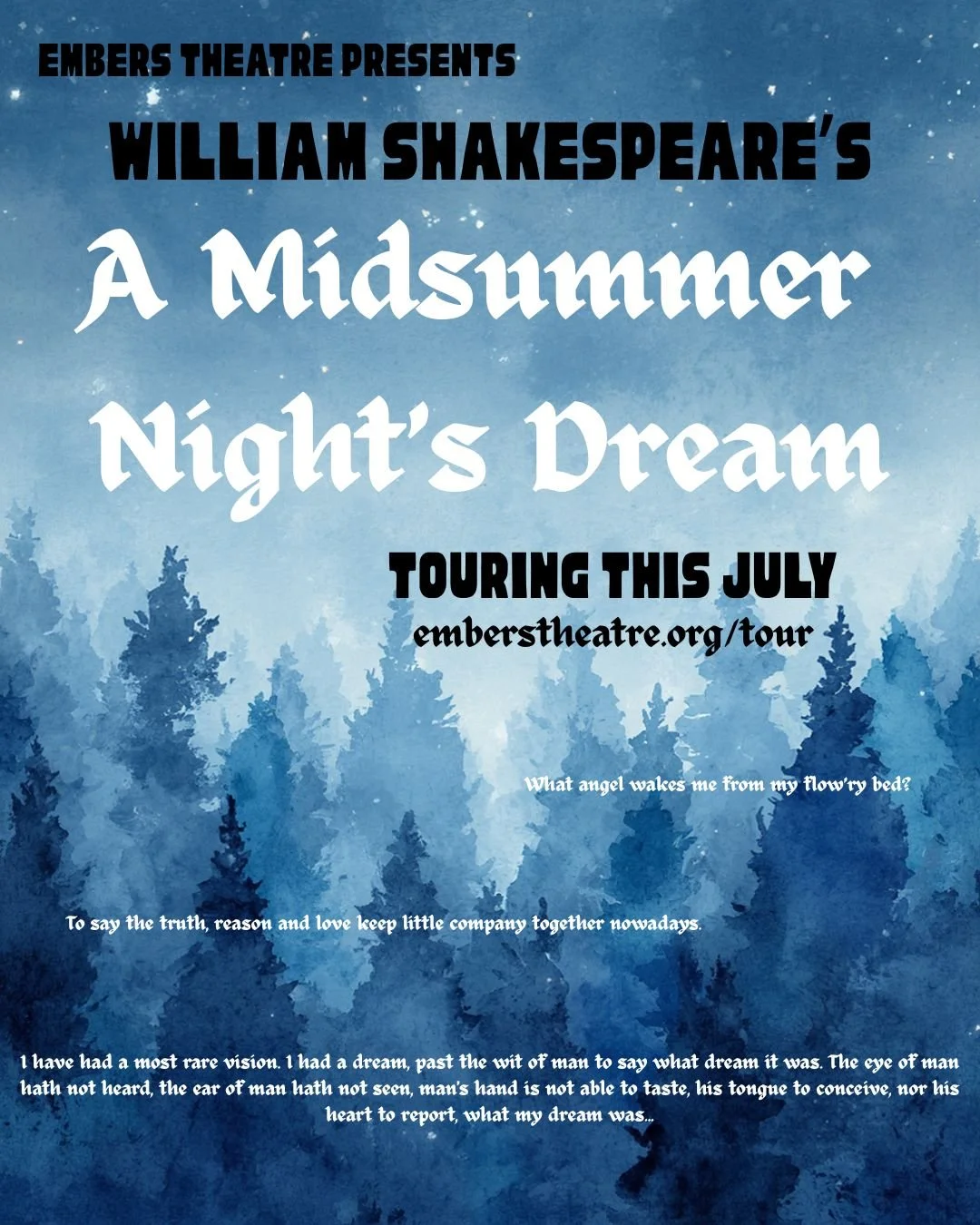 This summer we’ll be back with A MIDSUMMER NIGHT’S DREAM! Stay tuned for performance dates and email kiley@emberstheatre.org if you are interested in joining the troupe.